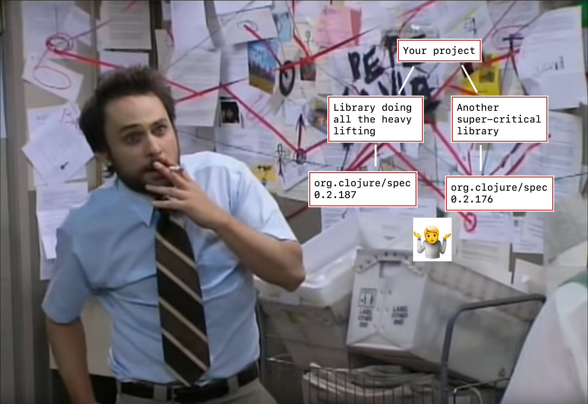 The good part of this solution, I think, was the idea that as long as you change namespace and library names, you introduce no conflict. The biggest problem of dependency hell is not breaking changes per se (just don’t upgrade until you are ready, right?). The problem happens when two of your dependencies transitively depend on different versions of the same library and those are incompatible. Since they both want to be, for example, clojure.spec, and runtime can only load one under that name, you must pick one, effectively breaking expectations for one of your libraries.