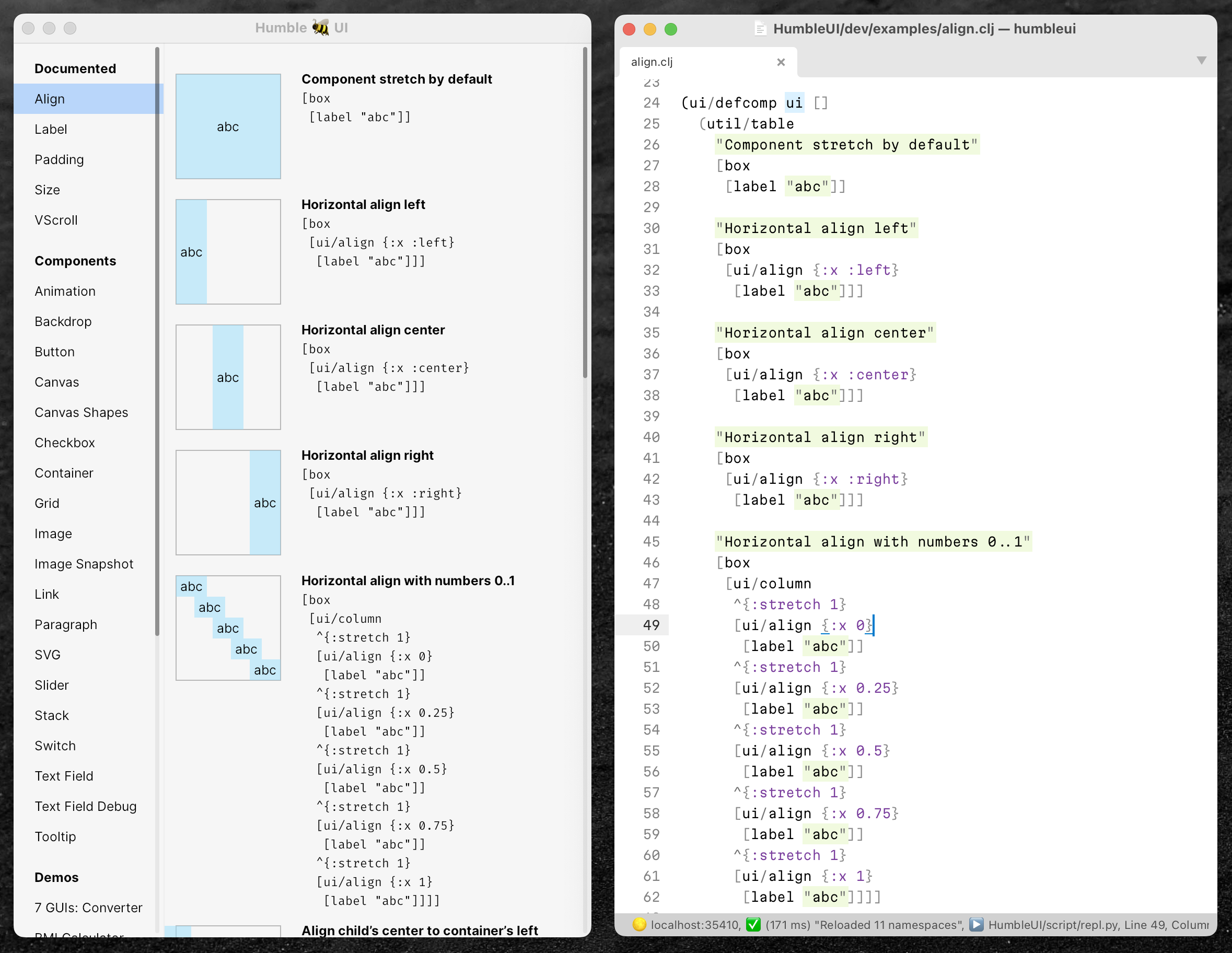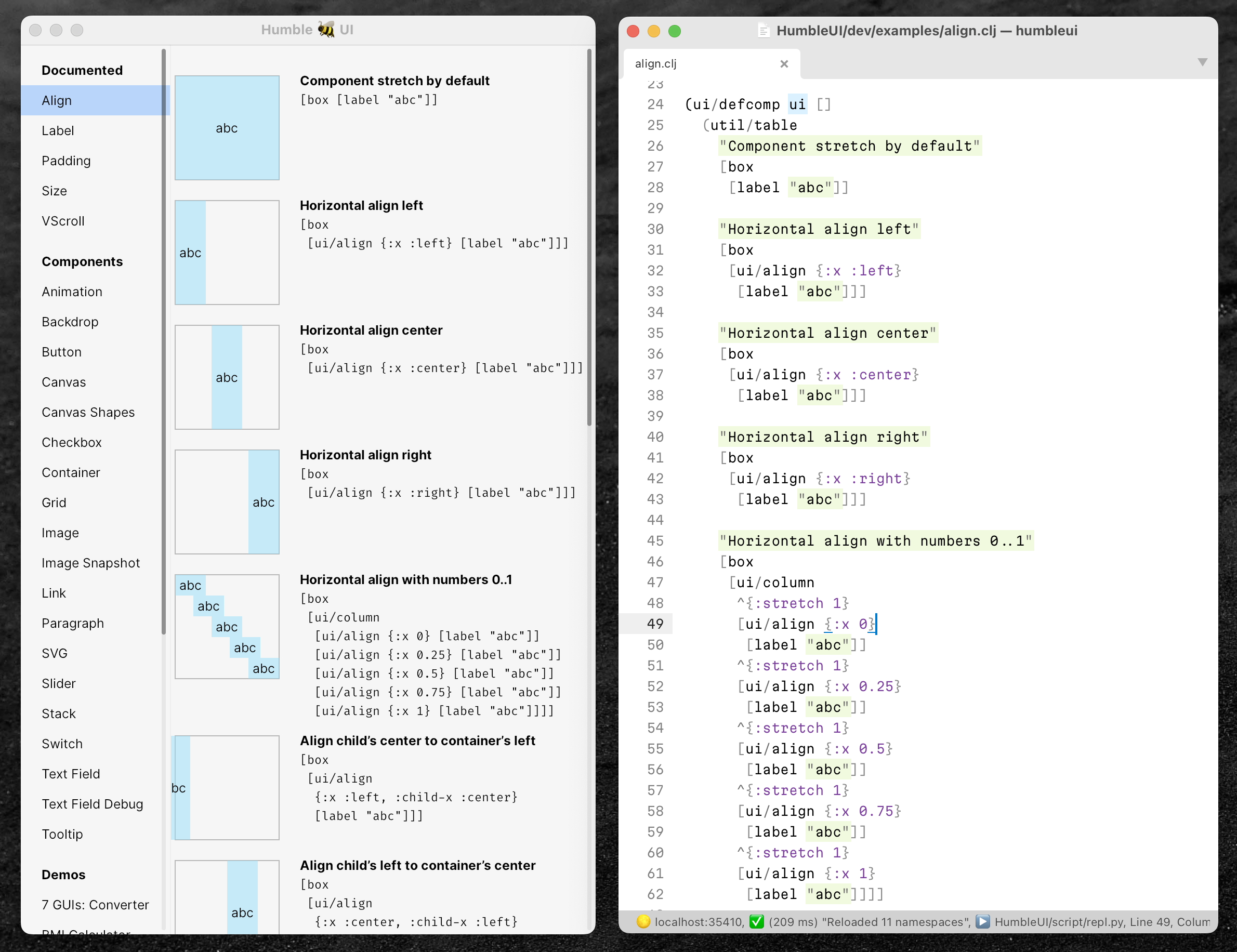 This is what I came up with: I write component code, and in the application, I show a table with the running code on the left and the source on the right: