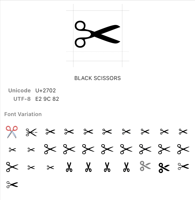 Guess what? When Apple Color Emoji was created, it had its own version of the same U+2702 codepoint that looked like this: