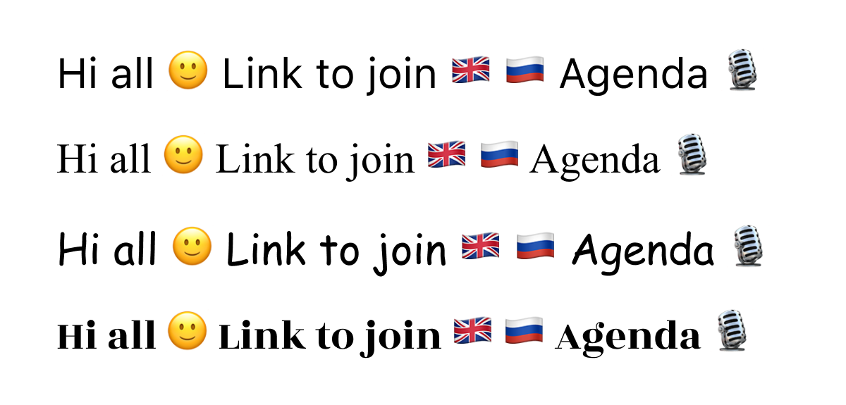 Now about the rendering. You donโt write your text in Apple Color Emoji or Segoe UI Emoji fonts (unless you are really young and pure at heart โค๏ธ). So how can a text set in e.g. Helvetica include emoji?