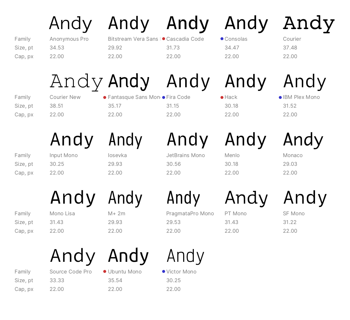 Another example. All these fonts have the identical size of 22 pt: