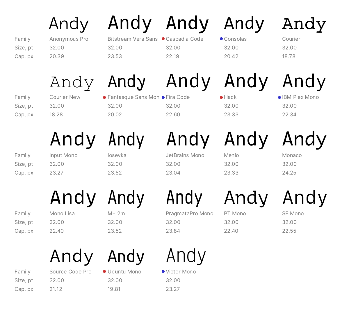 And here are all the same fonts, but resized to match cap height: