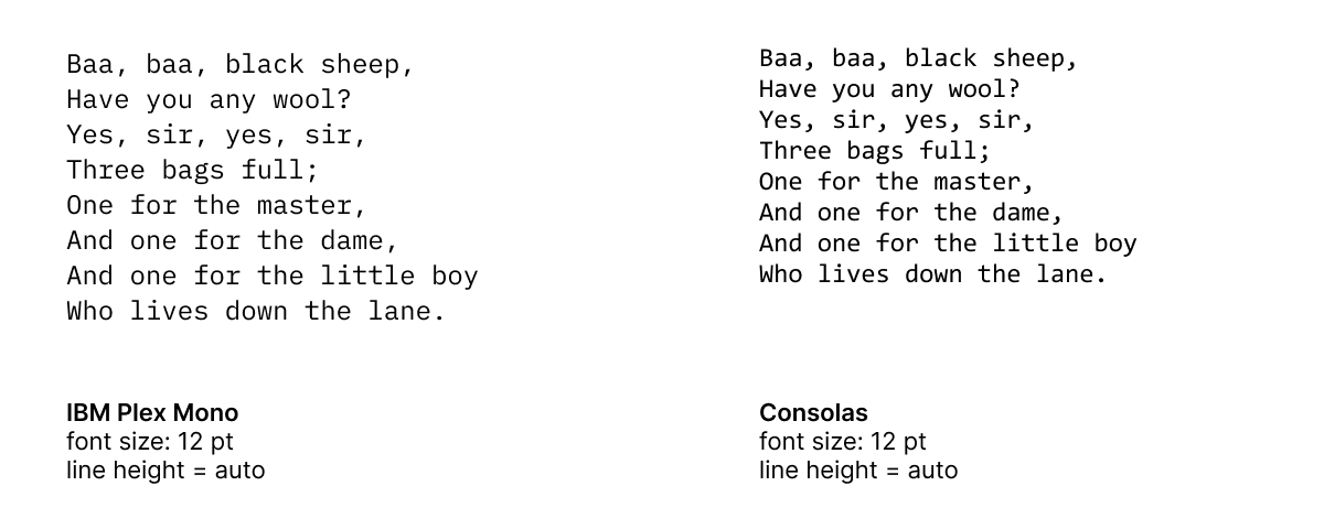 To me, the latter gives much better consistency. Look, for example, at Cascadia and Consolas. Or Hack and IBM Plex Mono. Or Ubuntu Mono and Victor Mono (two last ones).