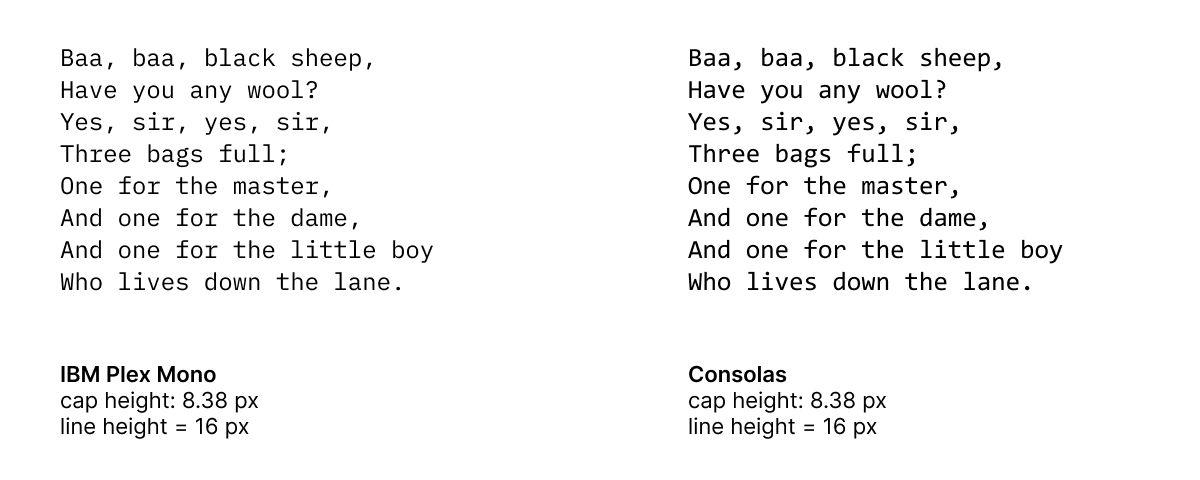 What to do? The reasonable way is to set line height directly in pixels, ignoring any font metrics. Maybe as a percentage of cap height, too, but definitely not font-size or “auto” line height!