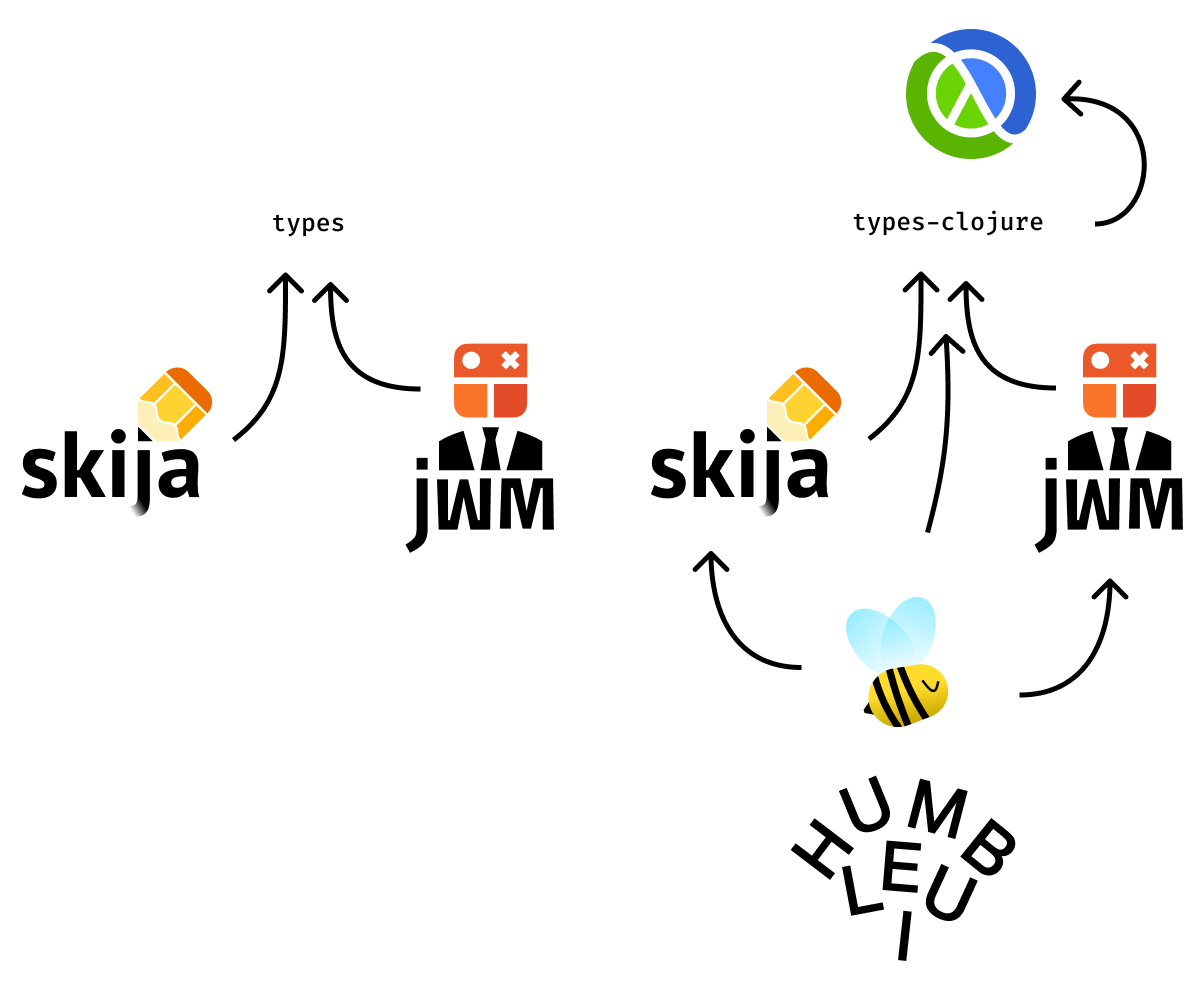 Both Skija and JWM depend on Clojure-free version of types. But when used through Humble UI we already have Clojure on classpath, so we replace types with types-clojure:
