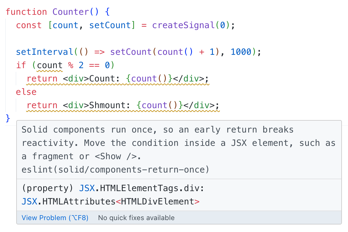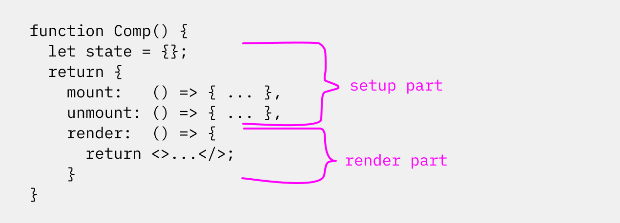 only text node containing {count} will be updated, and div will always stay the same. This is nice performance-wise, but I think the complications that come with that outweigh the benefits.