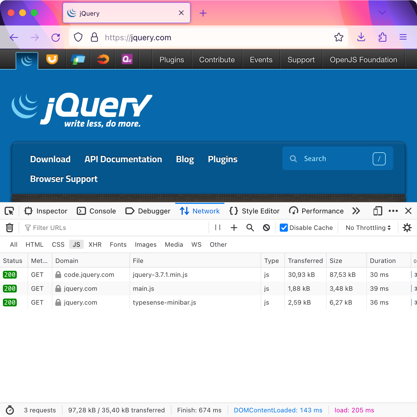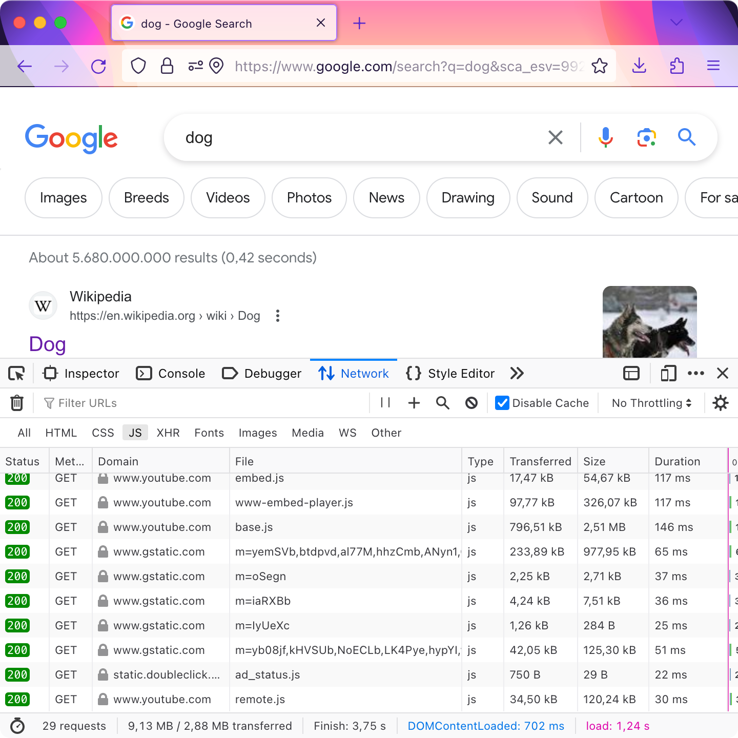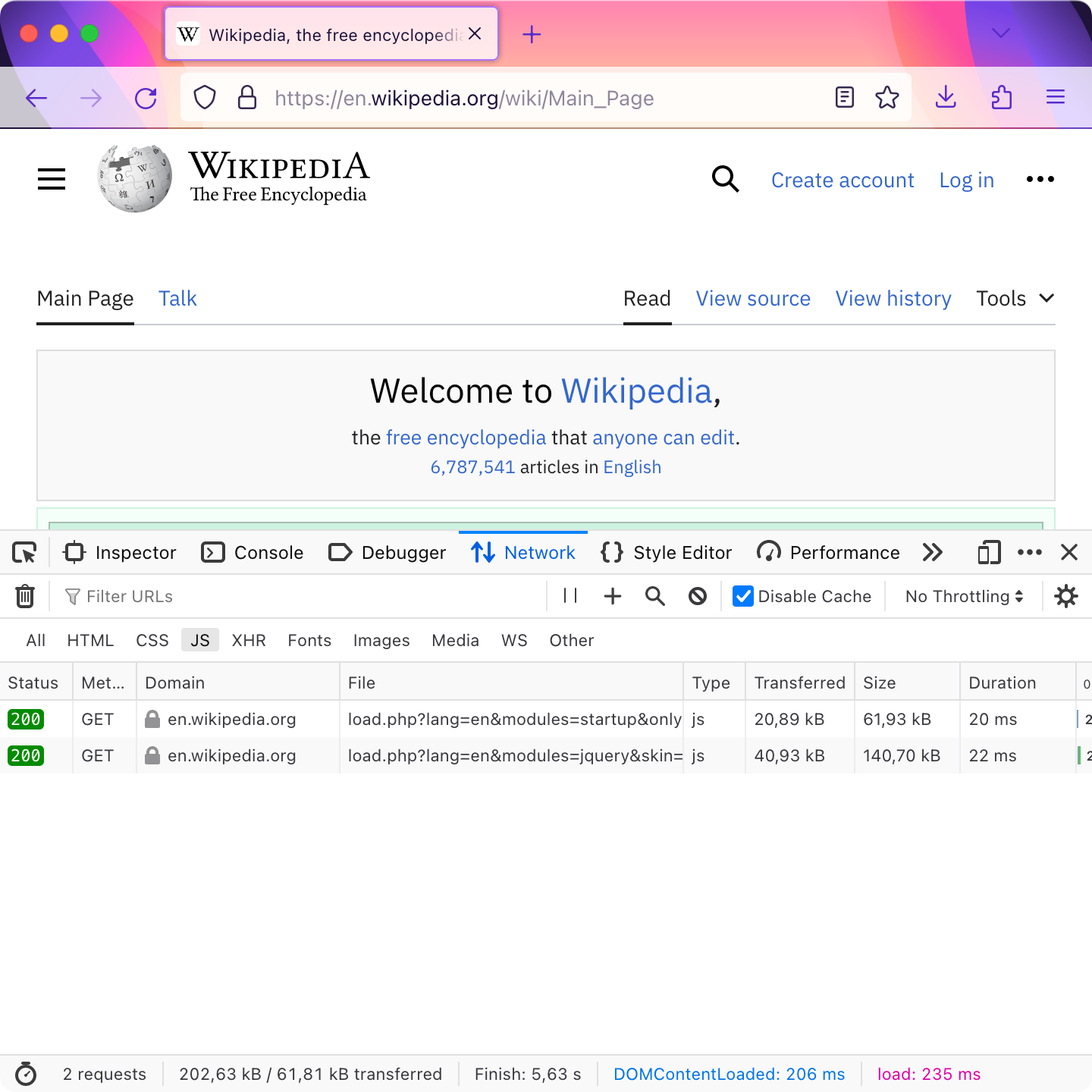 A normal slightly interactive page looks like this — Wikipedia, 0.2 MB:
