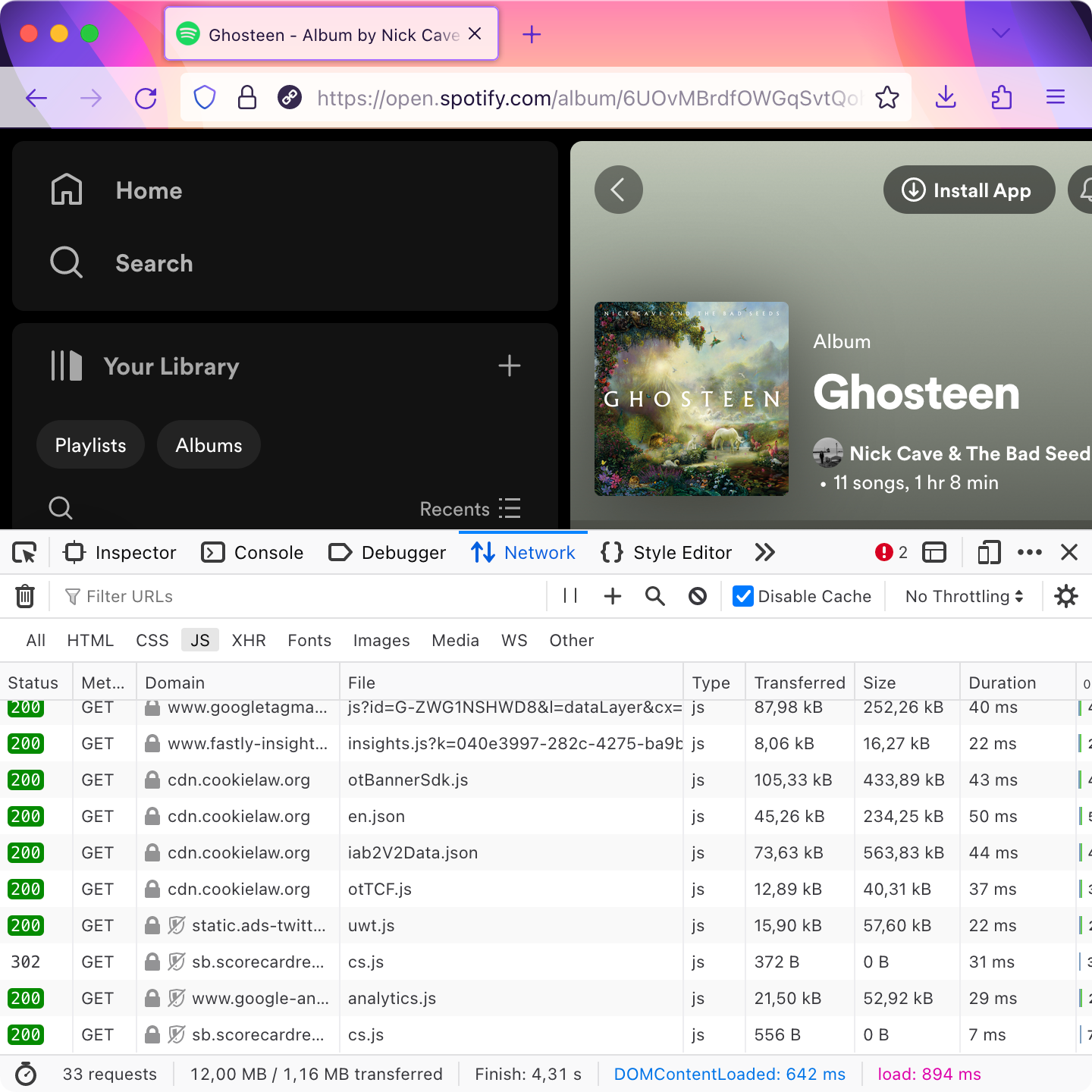 UPD: It has been brought to my attention that this behavior is not, in fact, representative of normal user experience. Normally embedded code editors will be cached after first load and subsequent loads will be served from disk cache. So as you scroll, you will see no network traffic, but these 100 MB of JS will still be parsed, evaluated and initialized over and over as you scroll.