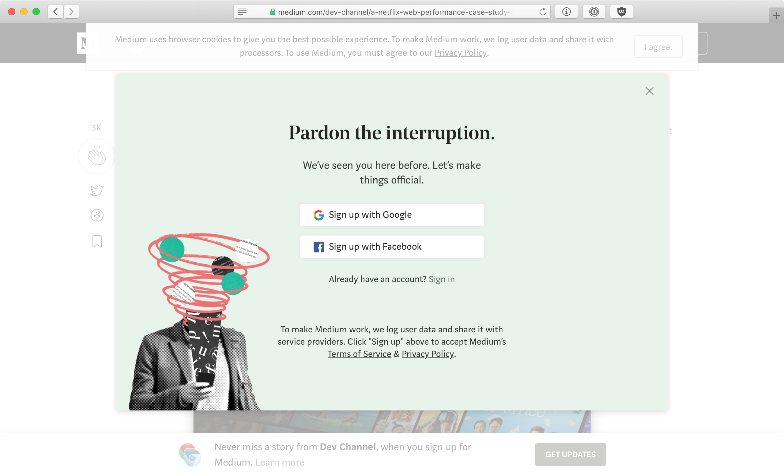 Every Medium article will greet each person who opens your link with a huge full-page banner every time: