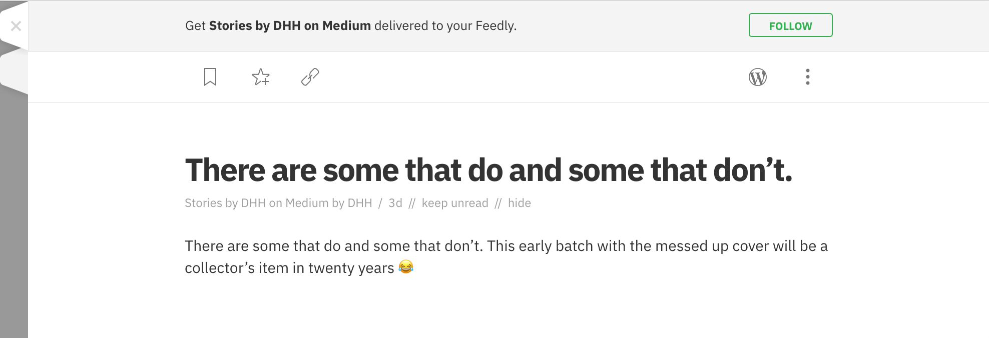 But the misadventures do not end here. If anyone decides to blog on Medium regularly, there’s no way to follow them through RSS. I mean Medium does serve RSS, but they serve it with replies and it turns the whole idea into a non-usable mess. You just get random phrases with no context in your feed instead of articles: