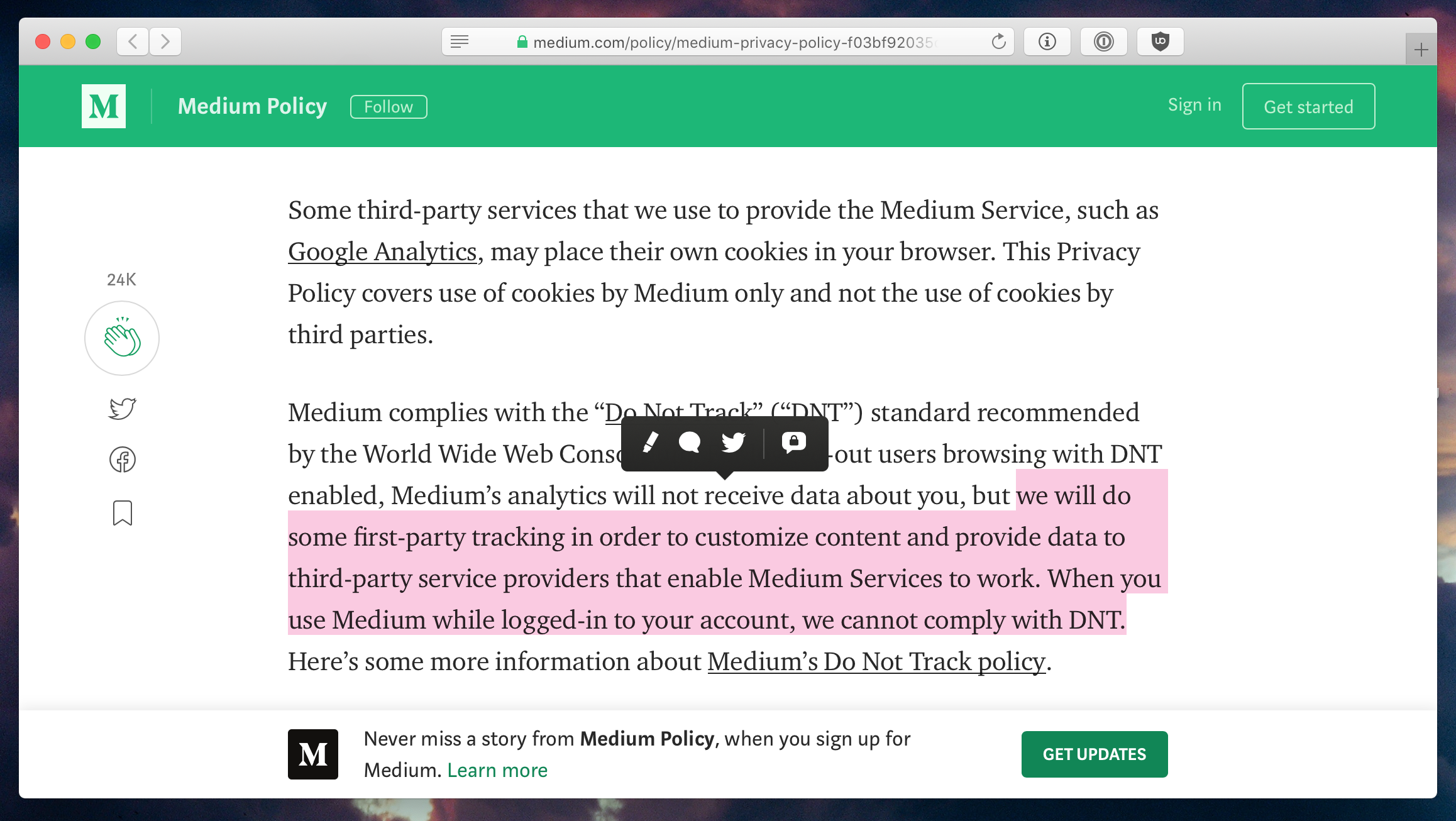 Every time you select text an annoying popup shows up. And if you accidentally click it (which is really easy to do because it pops up right under your cursor) you’ll be redirected to the login page (and lose your reading position) because God forbids unauthenticated users would try to do anything with their platform.