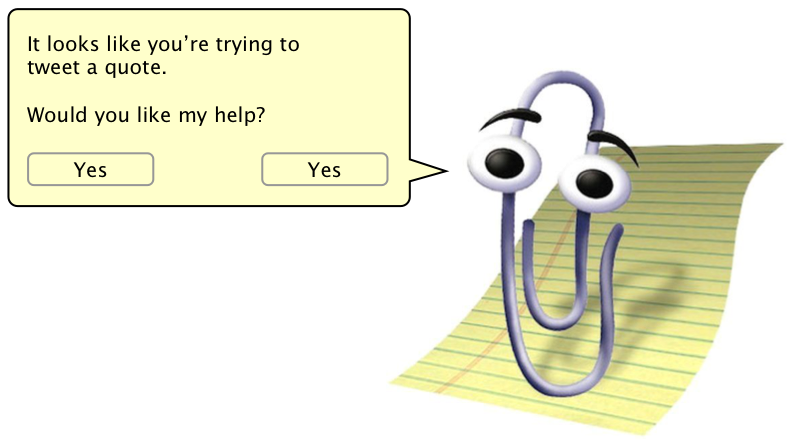 But maybe that popup is useful? I don’t know. Take me, for example. I’m perfectly capable of posting links and quotes on Twitter without any popup menus (and without converting them into an image first). In fact, popup menu makes it harder for me because I can’t safely select text and adjust selection anymore.