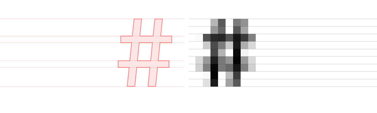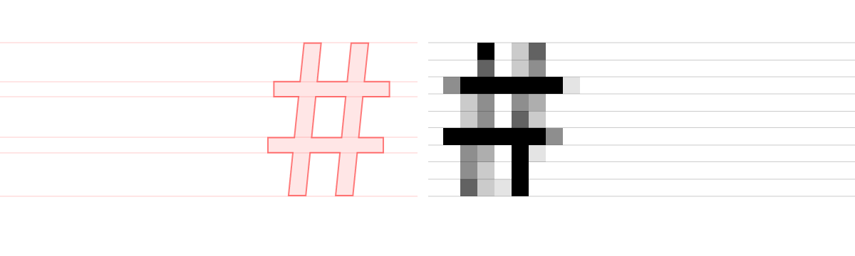 See how horizontal stems are offset from their actual position in the vector font file? The error here is as big as ¼ pixel!