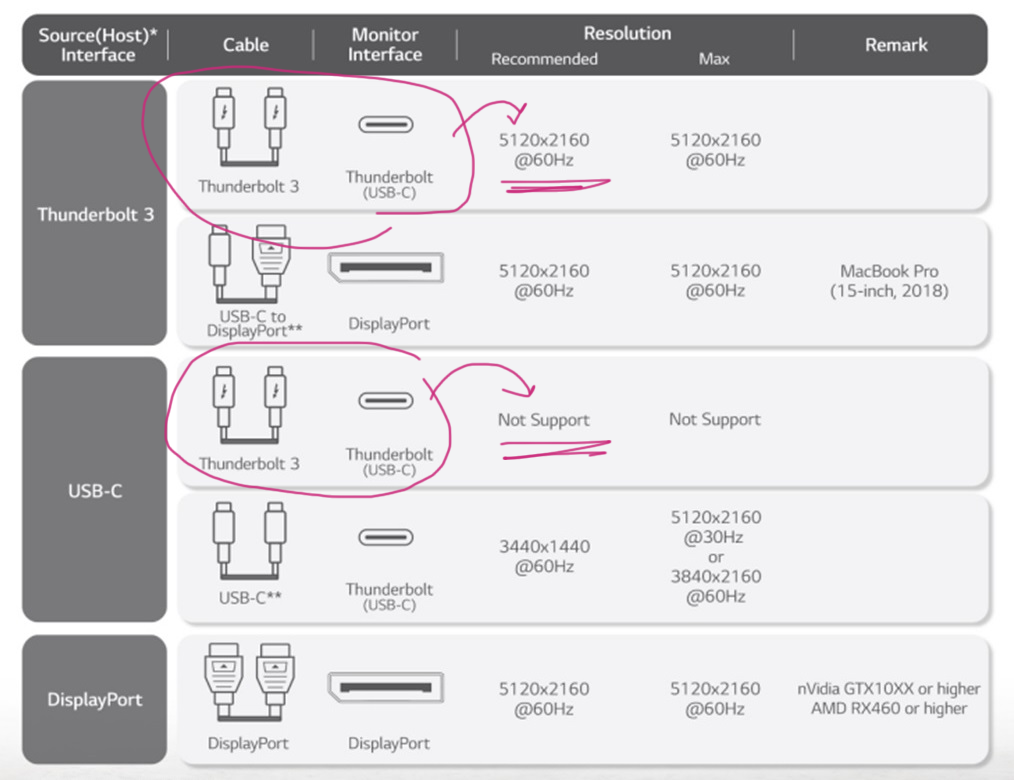 Turns out Thunderbolt 3 might or might not carry DisplayPort 1.4. Some of them only go as far as DP 1.2. The Wikipedia article suggests that anything before 2018 definitely won’t work, but after 2018 it might or might not work, depending on a Thunderbolt version. Feeling lost? Use my diagram: