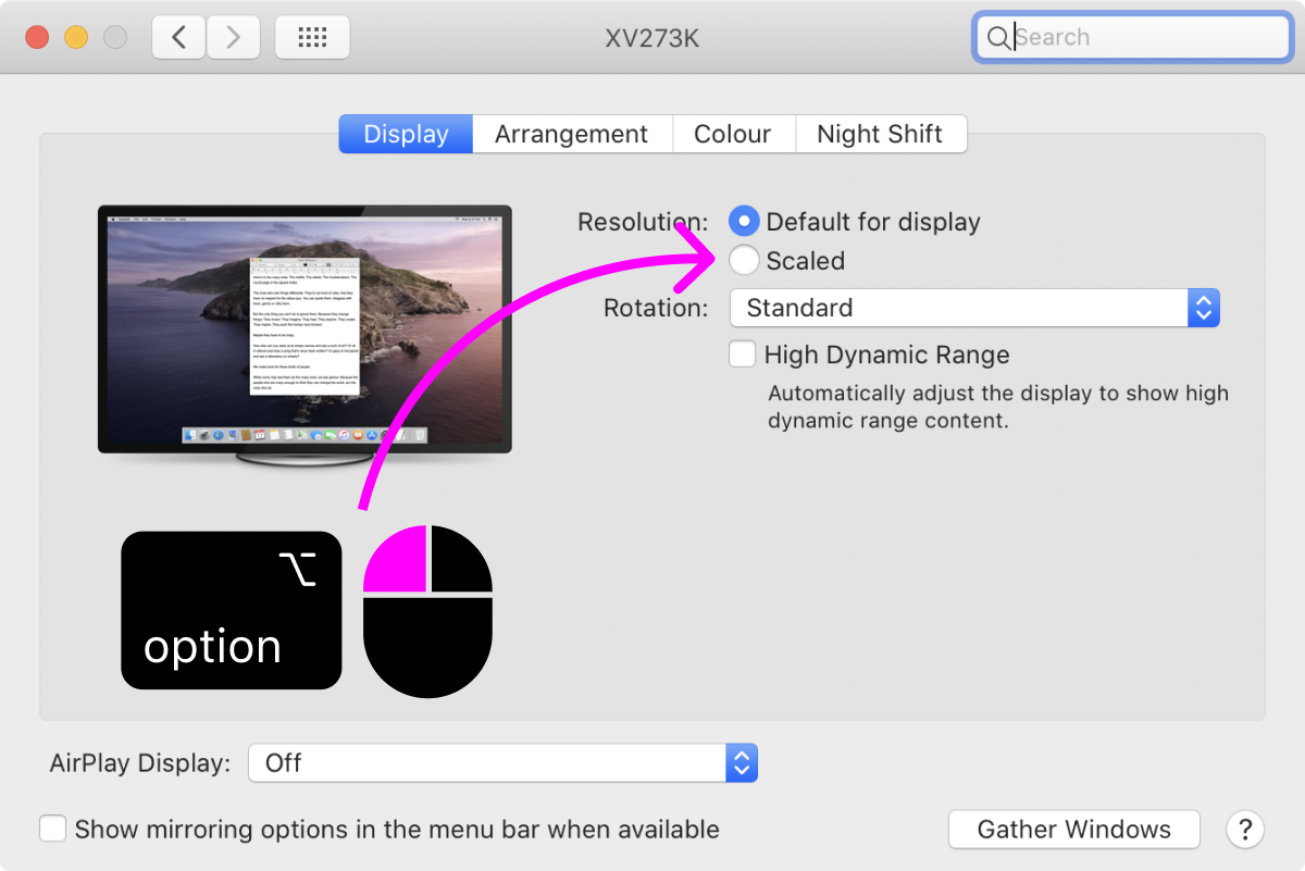 - While holding down Alt / Option key (the one with ⌥ on it), click on “Scaled” resolution.