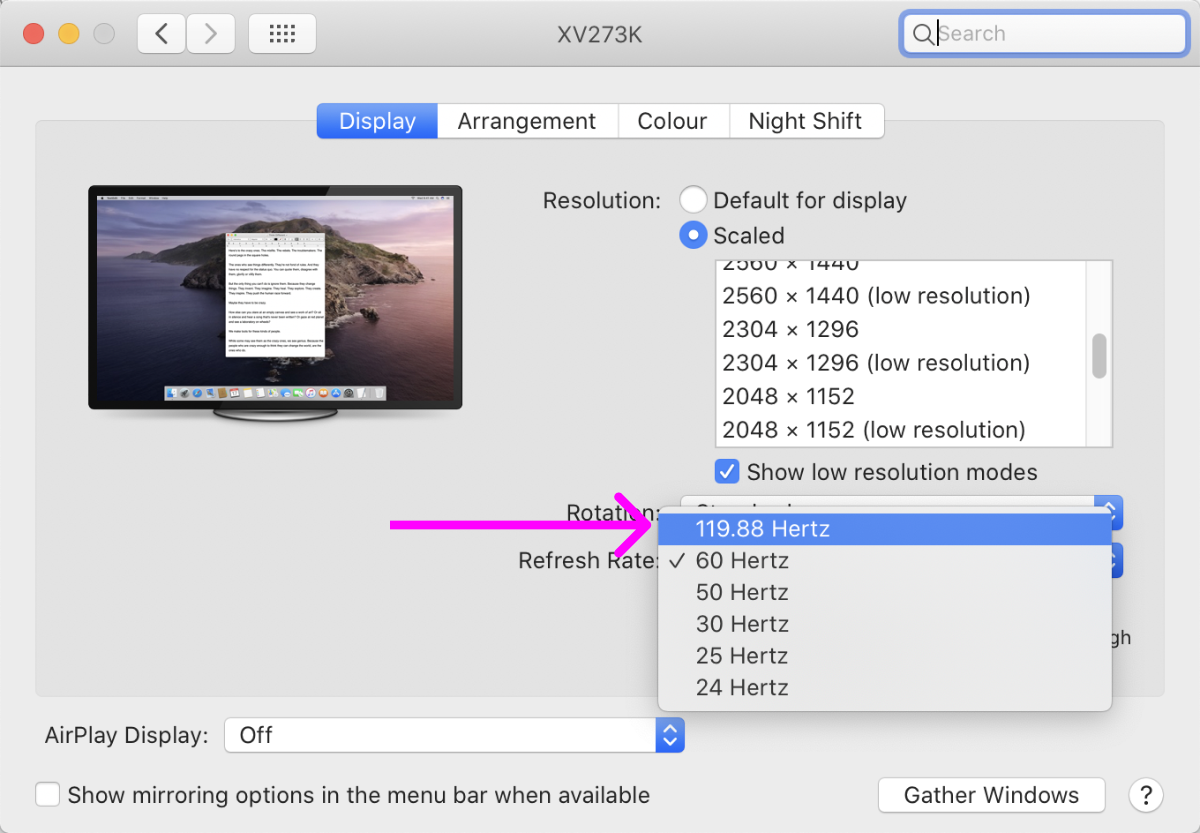 - Look again under “Refresh Rate”. Hopefully, there’s now a “119.88 Herz” option.