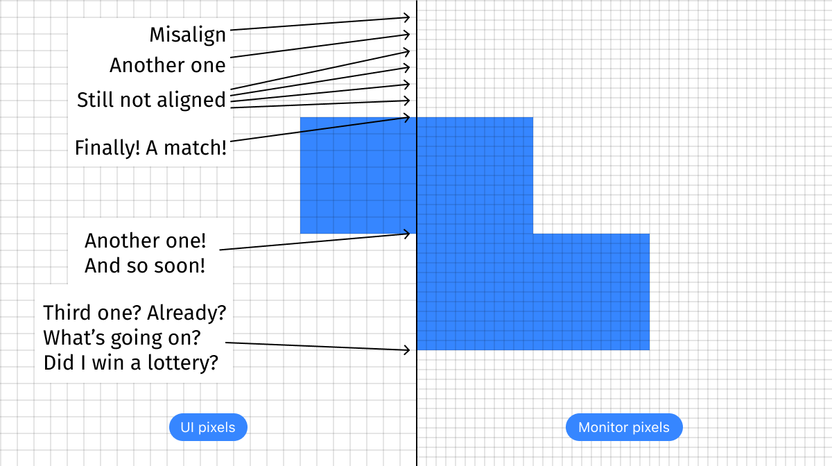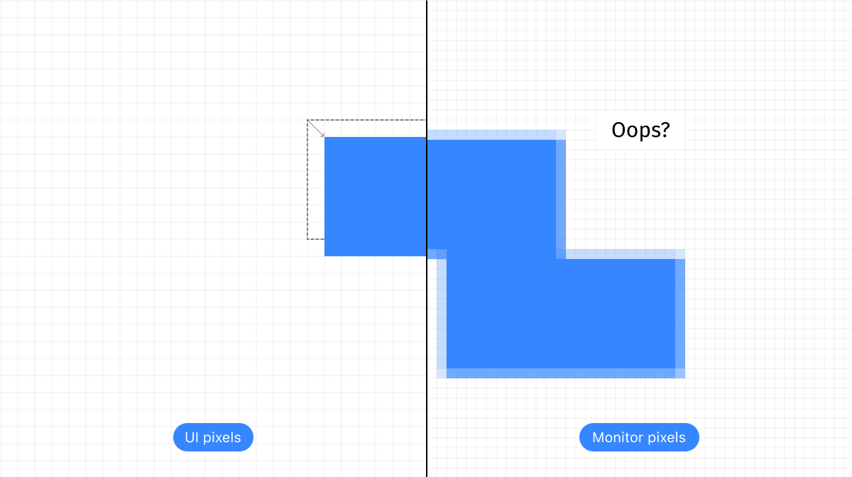 That’s right, UI isn’t even rendered in that weird target resolution. Every Mac app thinks it is rendering at 2×, and only after that OS scales it down to the target resolution. There’s a lot of precision and nuance lost due to this two-step resize process.