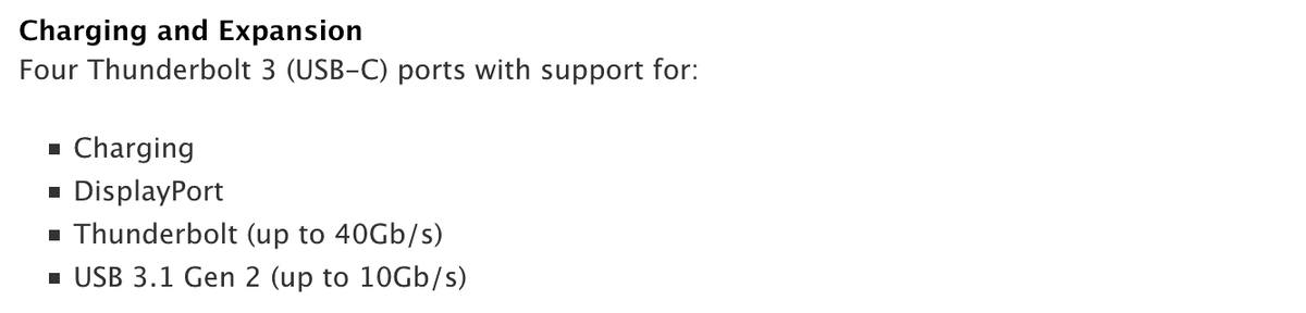 Then it says “DisplayPort over USB-C” (but we have Thunderbolt 3, not USB-C!). It does not specify the DisplayPort version, and it’s useless without it. It also says USB 3.1 Gen 2 is limited by 10 Gb/s, but I guess USB 3 limits do not apply to USB-C? Also, what kind of name is USB 3.1 Gen 2? Was USB 3.2 already taken?