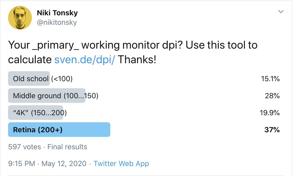 According to my research among programmers, 43% are still using monitors with pixel per inch density less than 150: