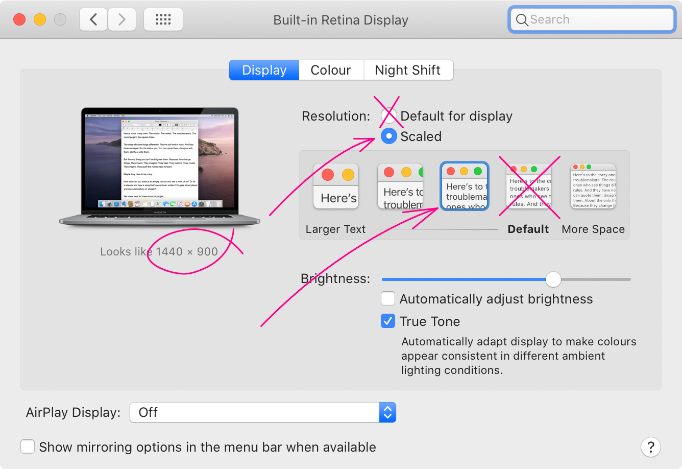 - While holding down Alt / Option key (the one with ⌥ on it), click on “Scaled” resolution.