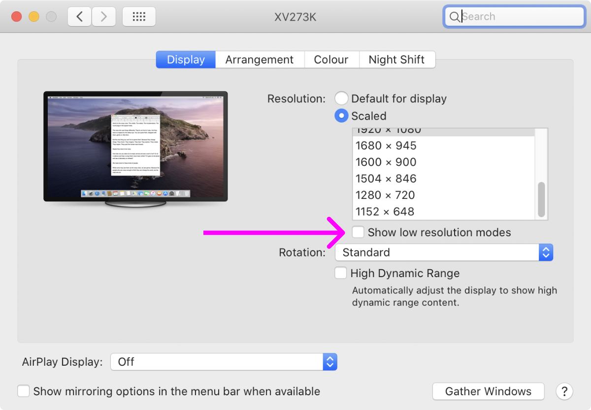 - To get access to Refresh rate chooser, check the “Show low resolution mode” checkbox. L for logic.