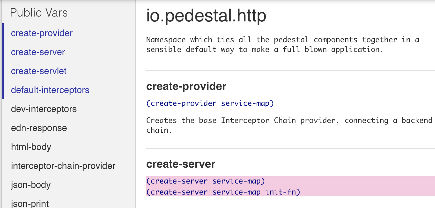 From one of the guides you can figure out that the method you need is io.pedestal.http/create-server which also has an empty API doc: