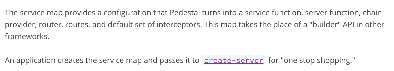 Another welcome change coming from Compojure: in Compojure, you wrap routes in middlewares, which means middlewares apply before routing happens. That works fine unless you want a different set of middleware at different routes. It certainly can be made to work in Compojure as well, just not the default. In Pedestal, routing happens first and everything else is configured per-route.