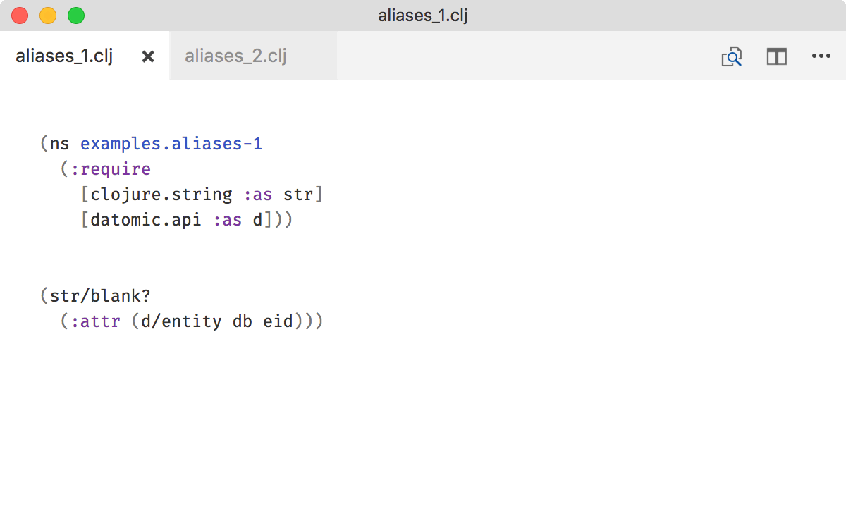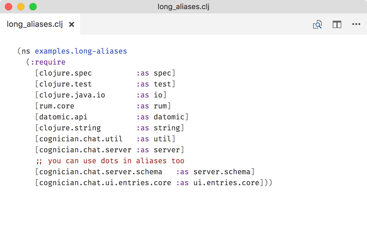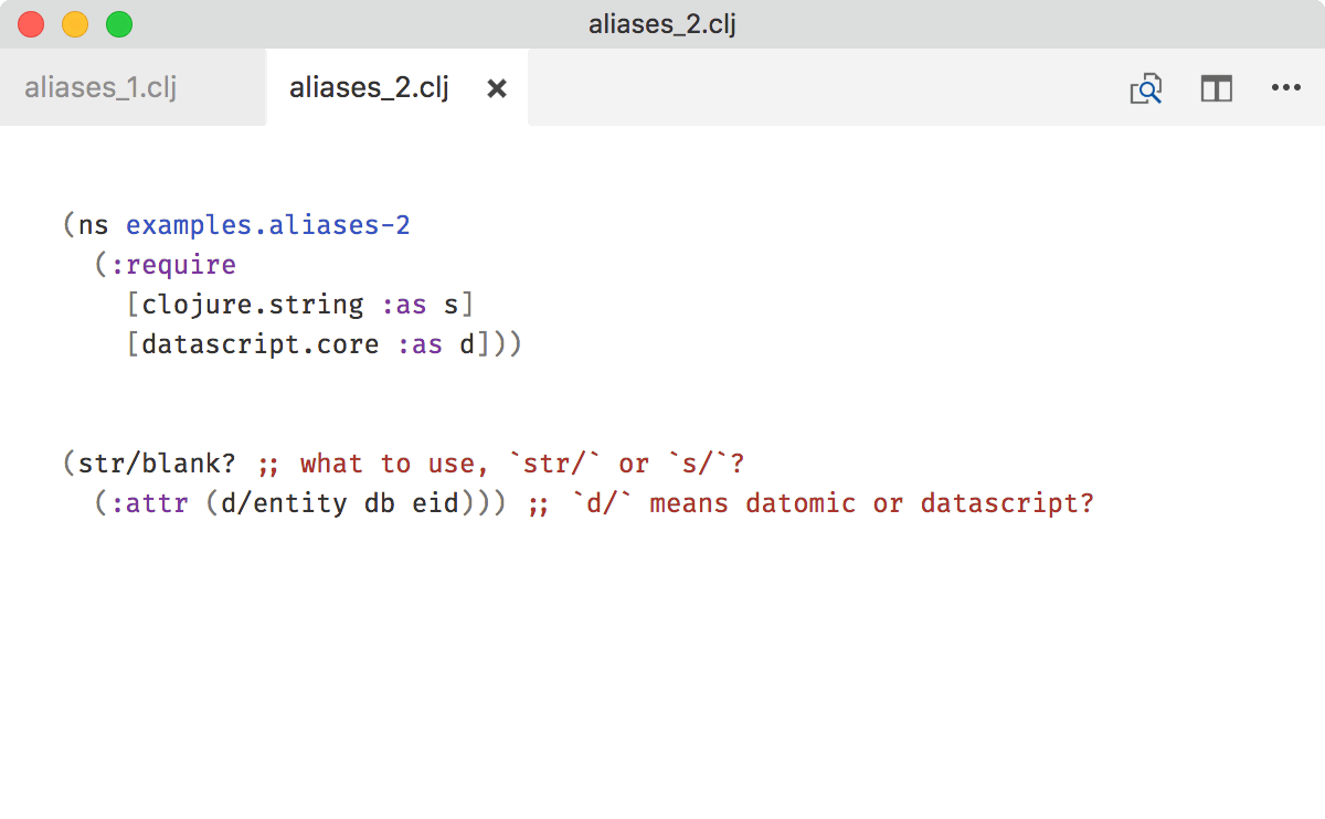 Keep aliases unique too. If d/entity could mean both datomic.api/entity or datascript.core/entity, you lose all the benefits of this rule.