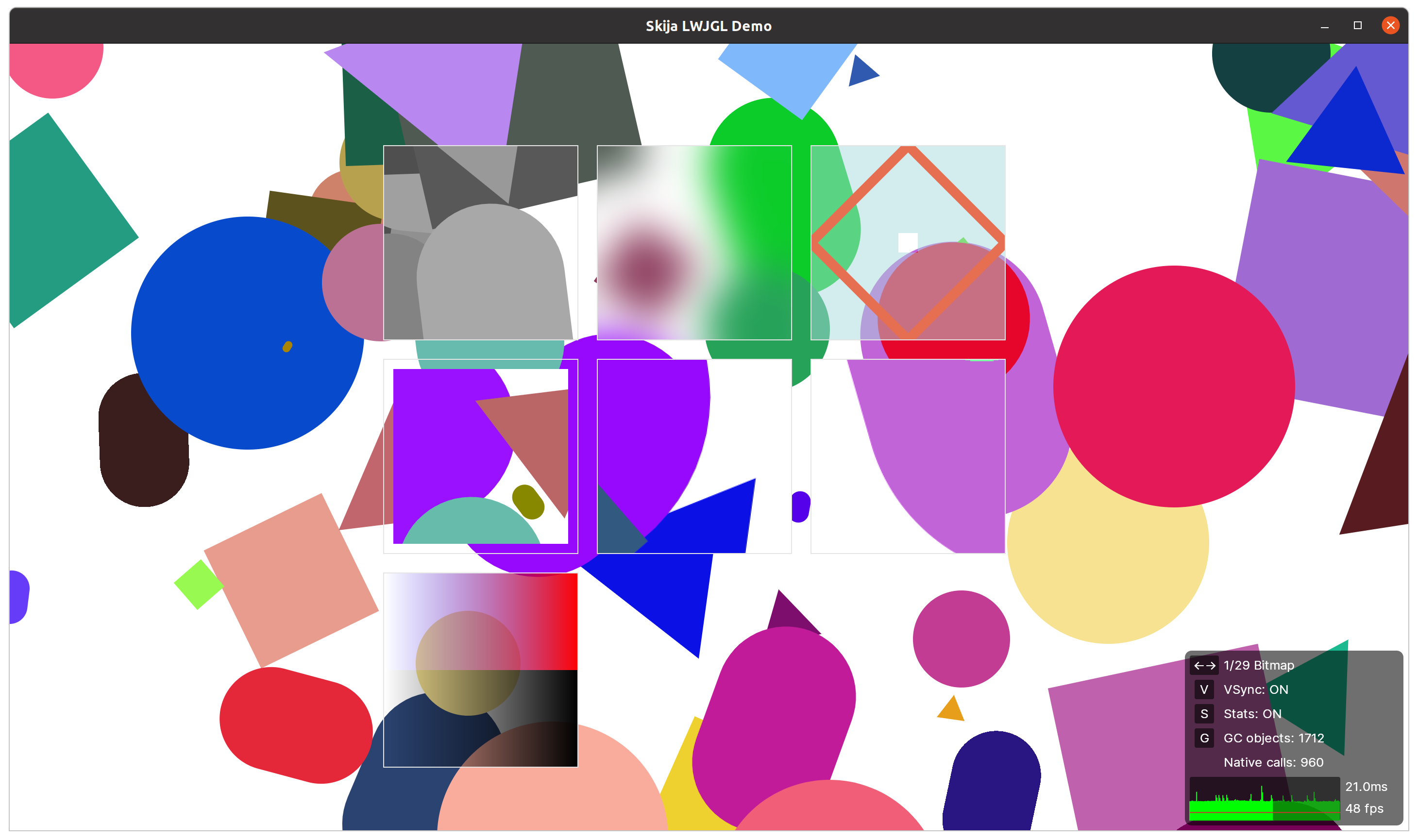 Like any other JVM library, it’s cross-platform. It runs on Windows, Linux and macOS. It’s as simple to use as adding a JAR file. Much simpler than massaging C++ compiler flags for days before you can even compile anything. Skija takes care of memory management for you. And the bindings are hand-crafted, so they always make sense and are a pleasure to use (as far as Skia API allows, at least).