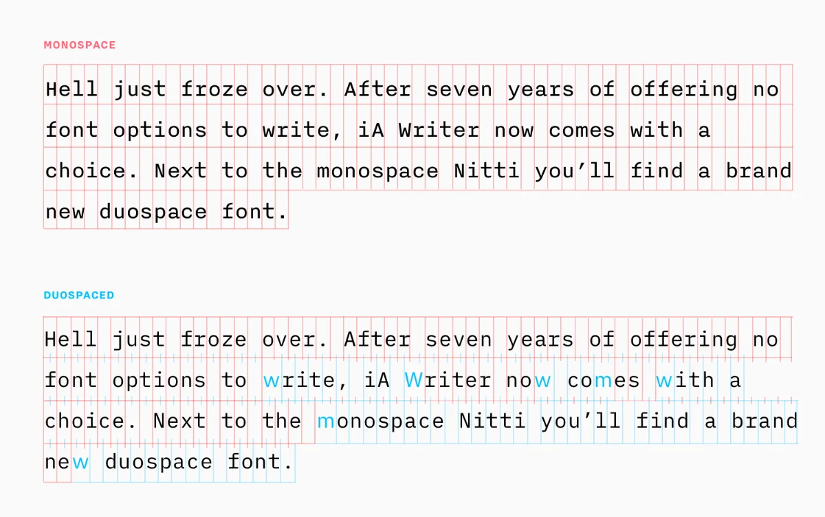 If you want to try out Duospace font, it’s available freely at github.com/iaolo/iA-Fonts.