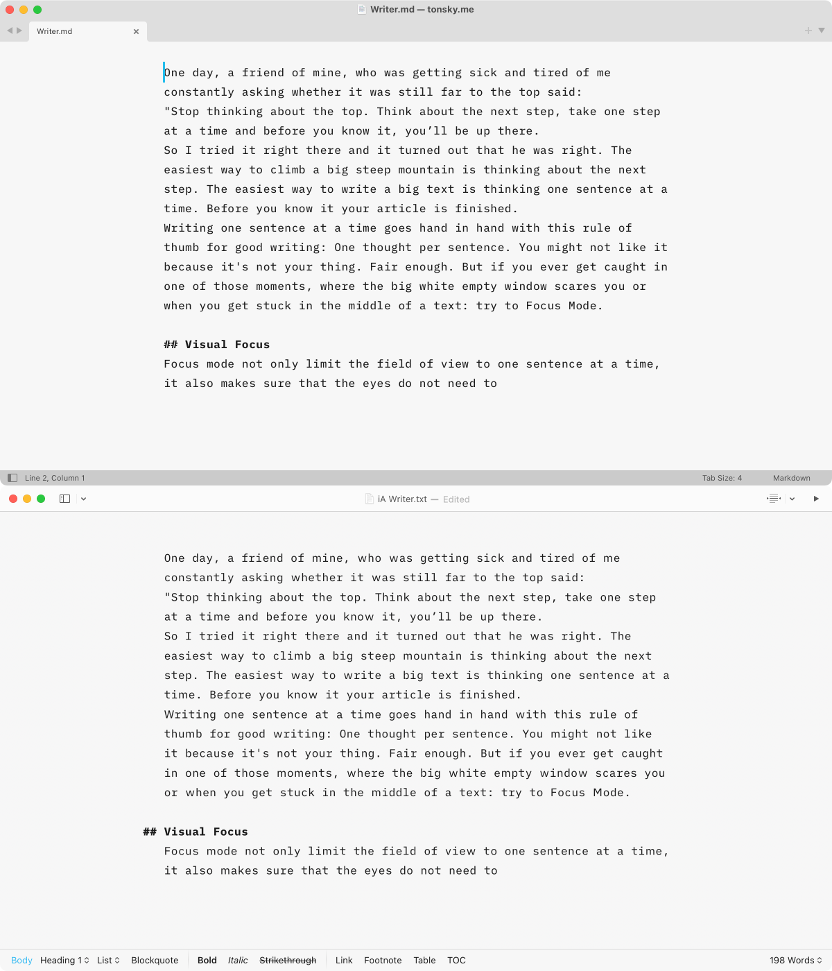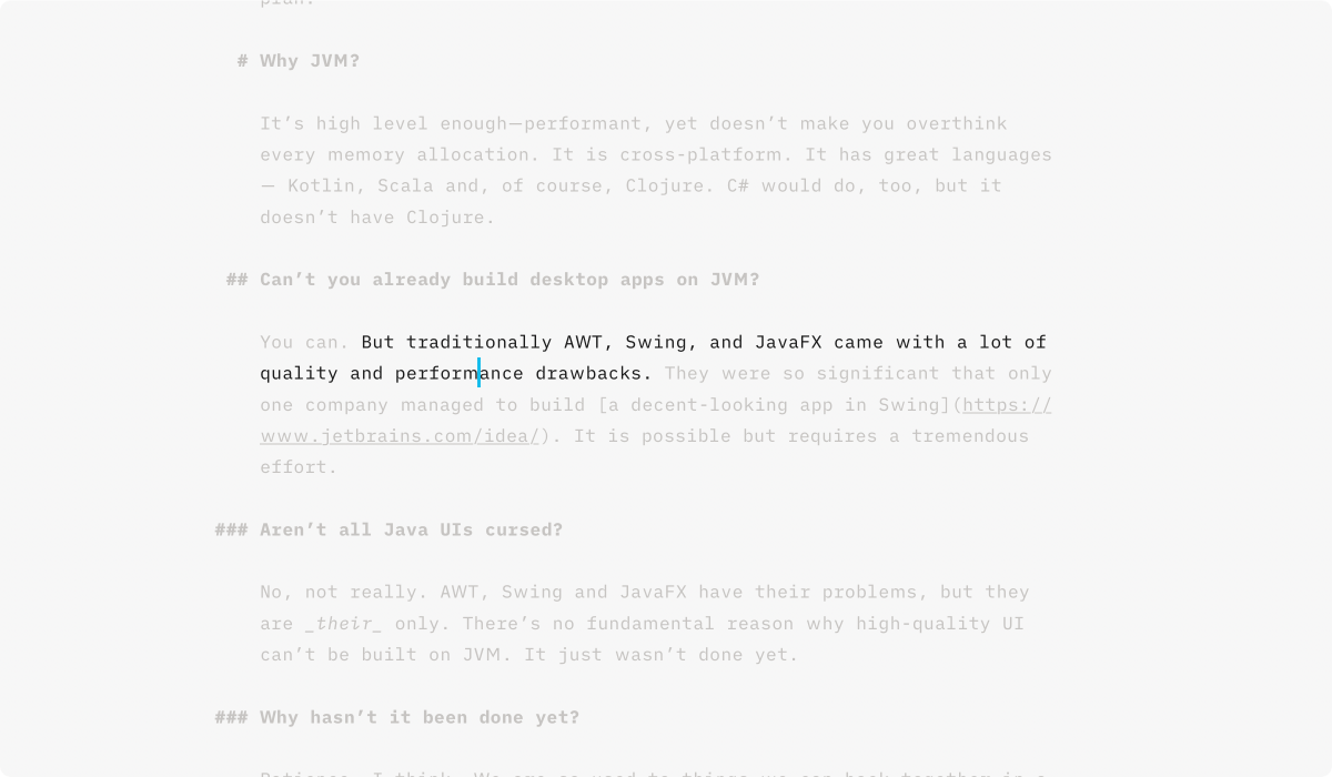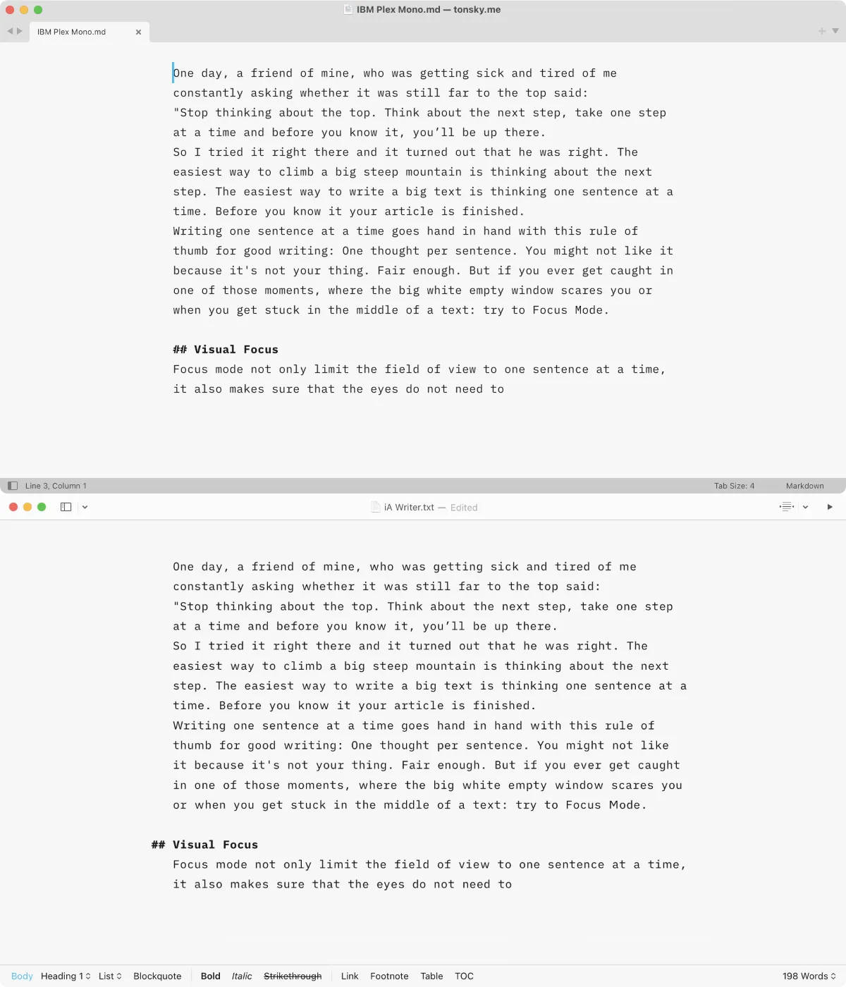 Another thing that is hard to reproduce in Sublime Text is dynamic typography. As far as I understand, iA Writer switches dynamically between multiple versions with different spacing and weights depending on current font size and screen DPI. This is hard to reverse-engineer and even harder to reproduce in Sublime Text.