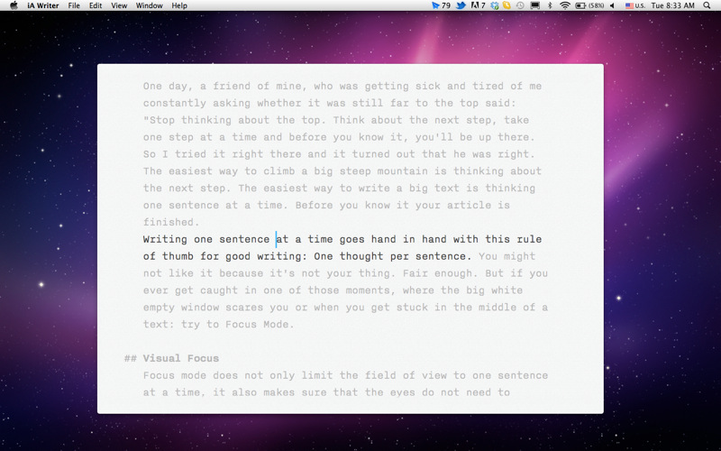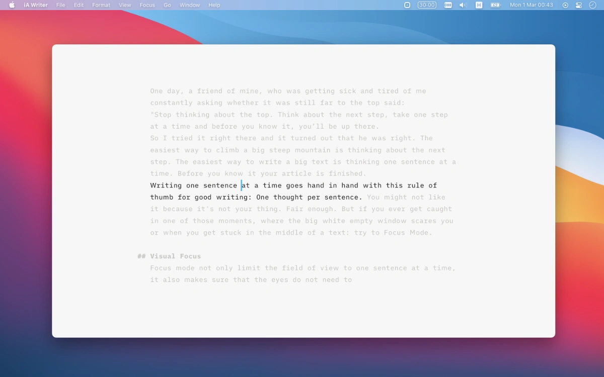 In Focus mode only the current sentence is highlighted, everything else is dimmed. Helps you get into the zone, I wish this one was doable in ST.
