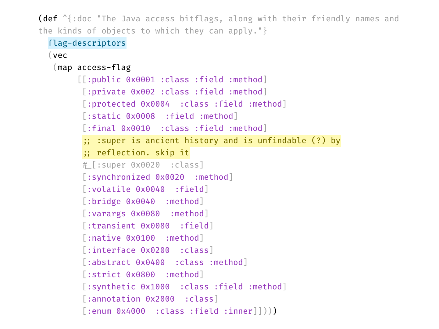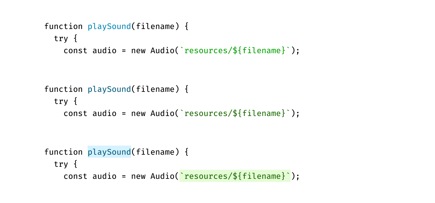 Something there isn’t a lot of. Remember—we want highlights to stand out. That’s why I don’t highlight variables or function calls—they are everywhere, your code is probably 75% variable names and function calls.