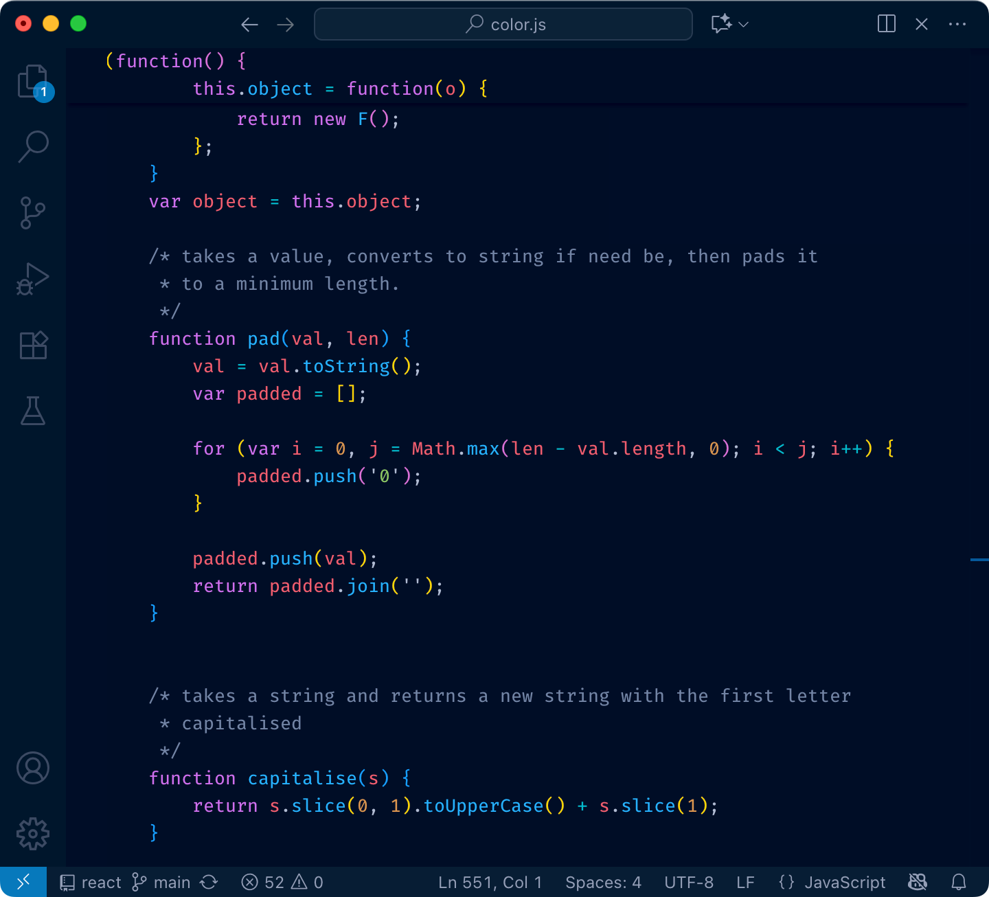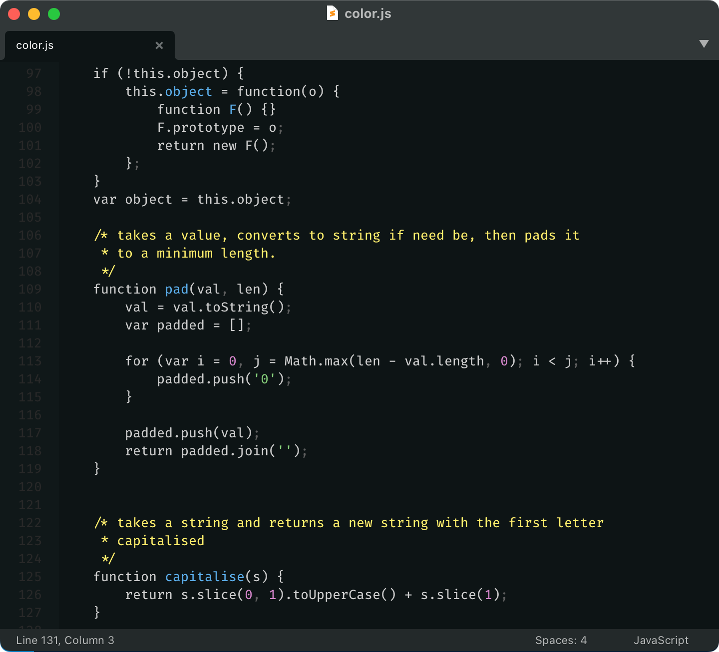 Finally, let’s rotate colors a bit. We want to respect nesting logic, so function declarations should be brighter (yellow) than variable declarations (blue).