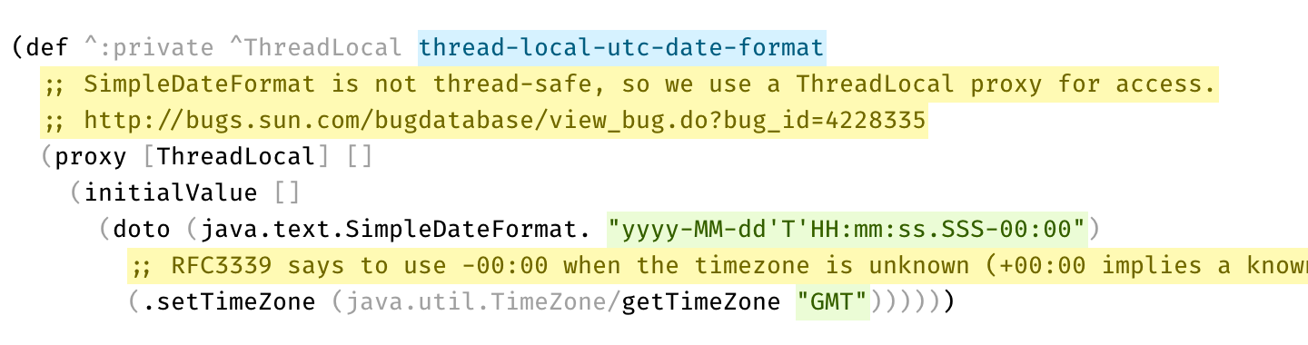 Here’s a real example from Clojure codebase that makes perfect use of two types of comments: