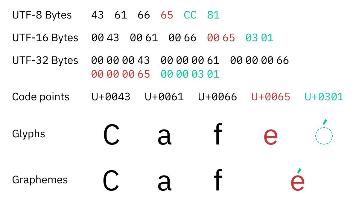Therefore, we get all the problems we have with variable-length encodings, but now on code point level: you can’t take only a part of the sequence, it always should be selected, copied, edited, or deleted as a whole.