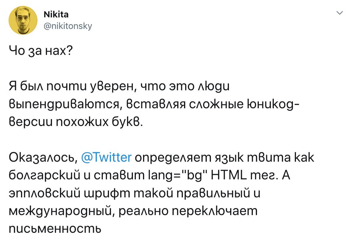 - Cuando se necesita, tiene que adivinarse. Por ejemplo, Twitter intenta deducir la configuración regional del texto del tweet (porque, ¿de dónde más podría obtenerla?) y, claro, a veces se equivoca: