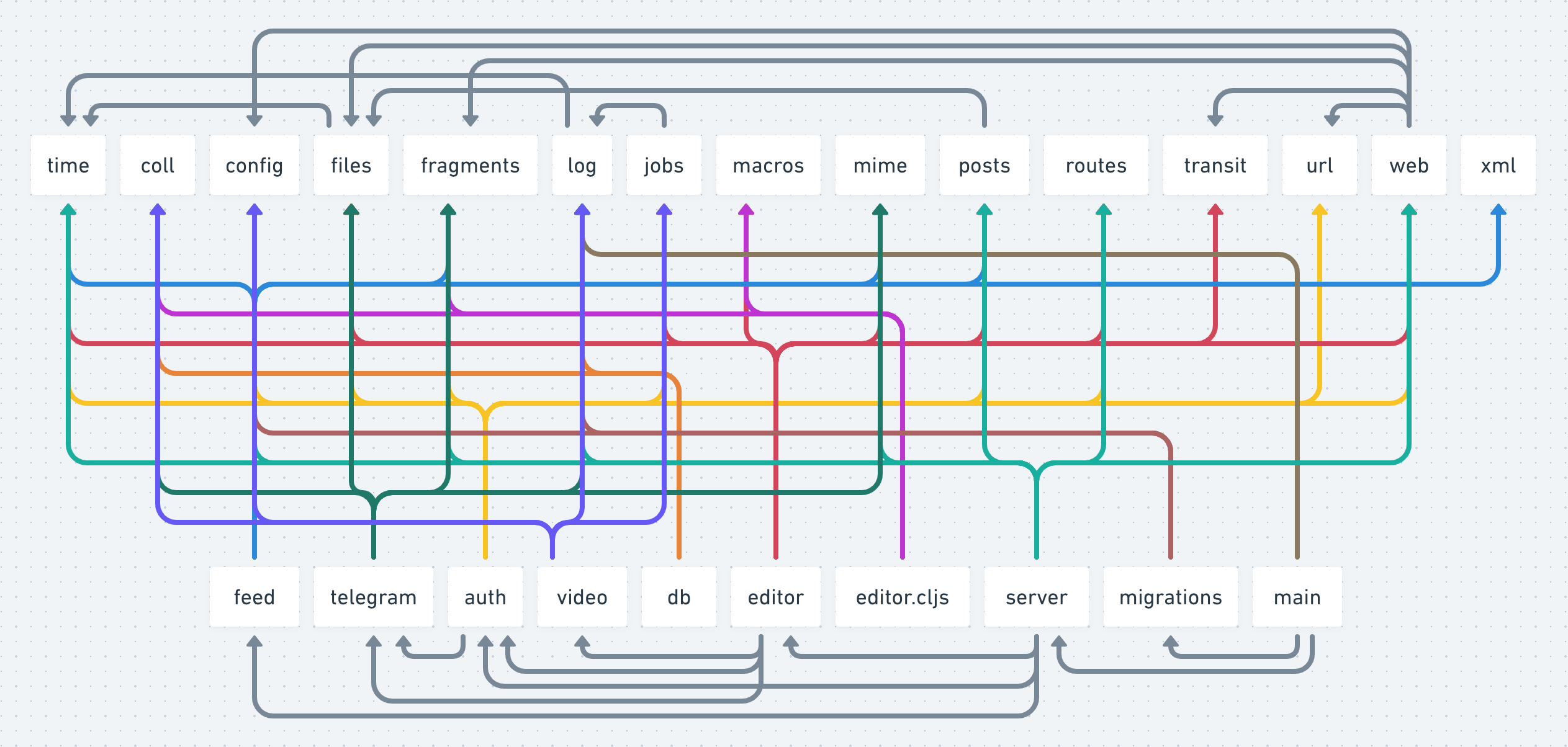 It also makes thinking about dependencies somewhat easier. You have a two-part graph: reusable libraries and business code. The bottom half can depend on the top half, but not vice versa. Here’s how it looks in Grumpy right now (arrows means “depends on”):